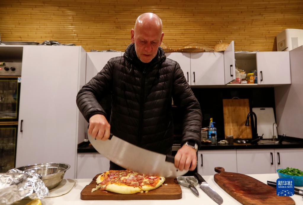 阿明在民宿的厨房内为客人切披萨(3月23日摄)。新华社记者 杜宇 摄