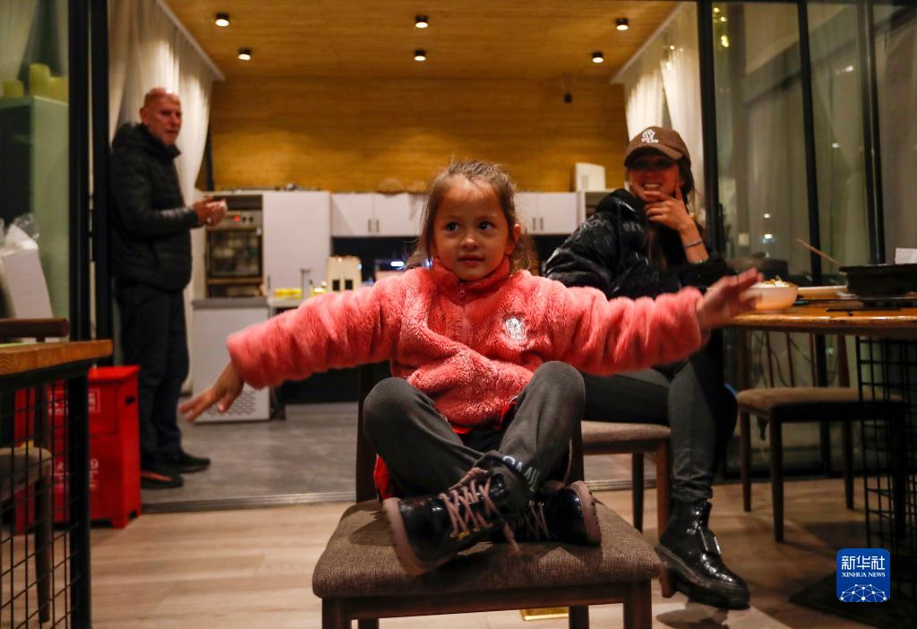 阿明和妻子黄琼观看女儿阿琳娜(中)为民宿客人表演节目(3月23日摄)。新华社发 (施亚磊摄)