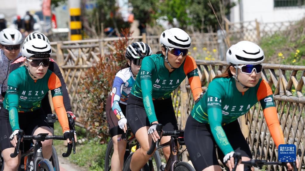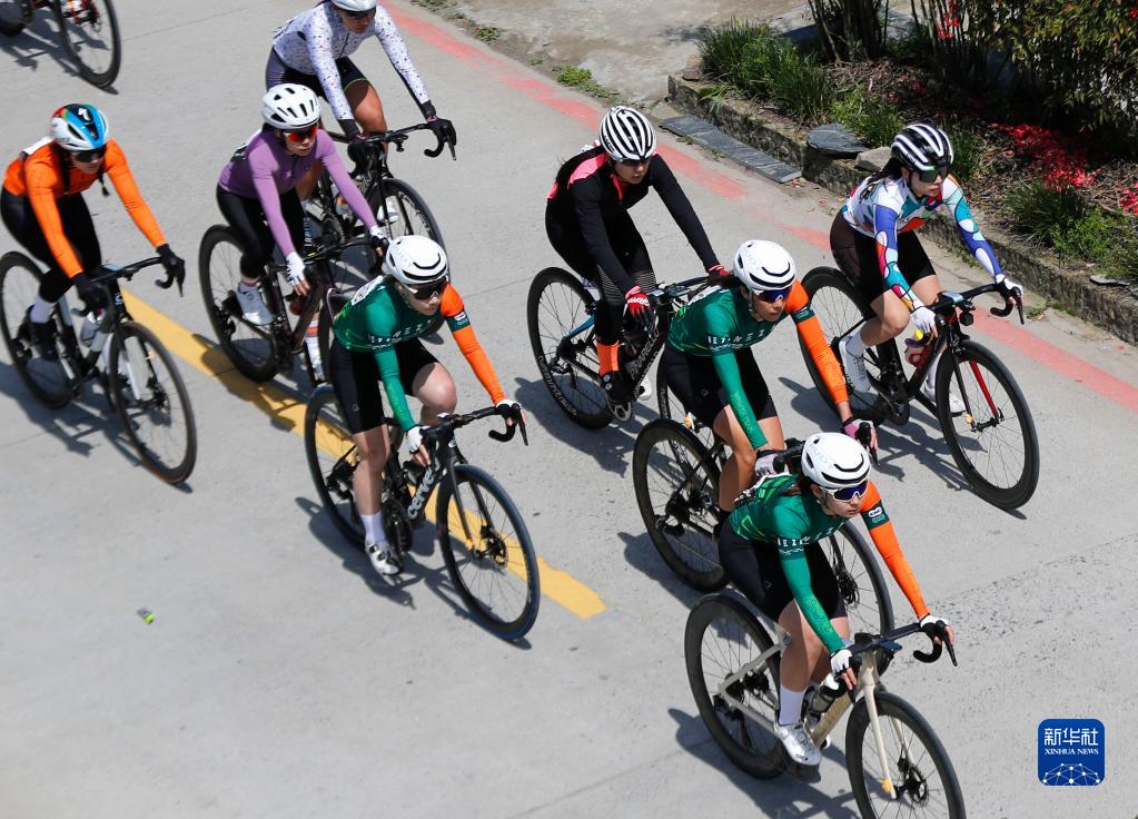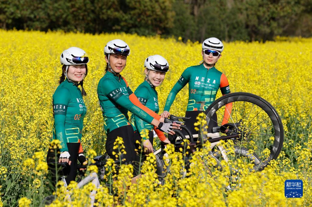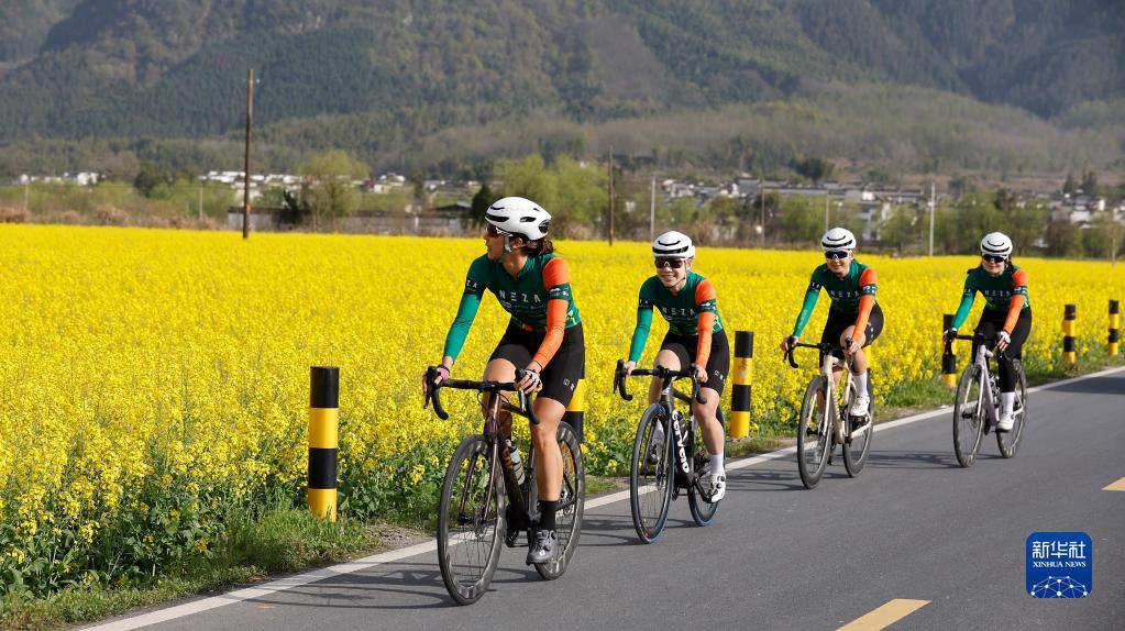 谢敏仪(左一)和队友在黟县乡间道路上进行骑行练习(3月26日摄)。新华社记者 张晨 摄