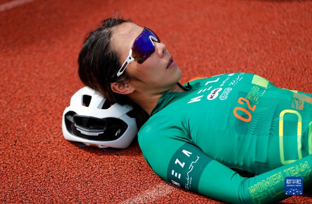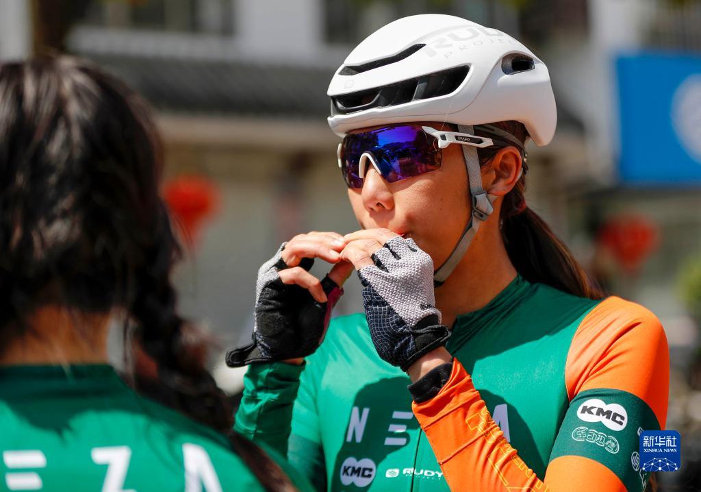 谢敏仪参加女子公路自行车赛精英组比赛时,在两赛段间休整(3月26日摄)。新华社记者 杜宇 摄