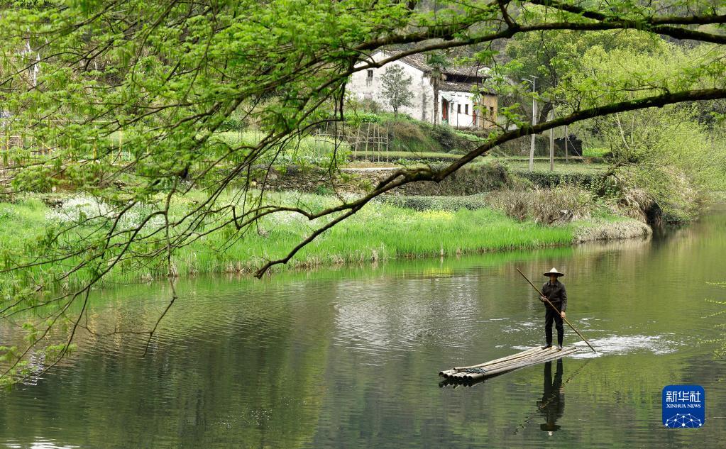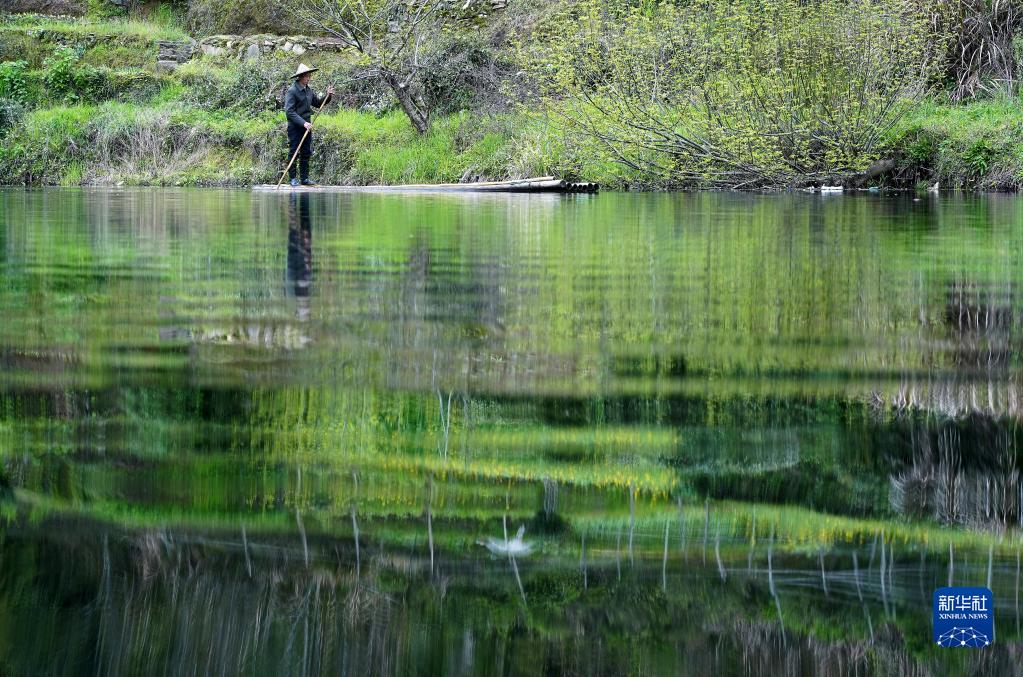 马青海在家门口的小河里划竹排(3月30日摄)。新华社记者 万象 摄