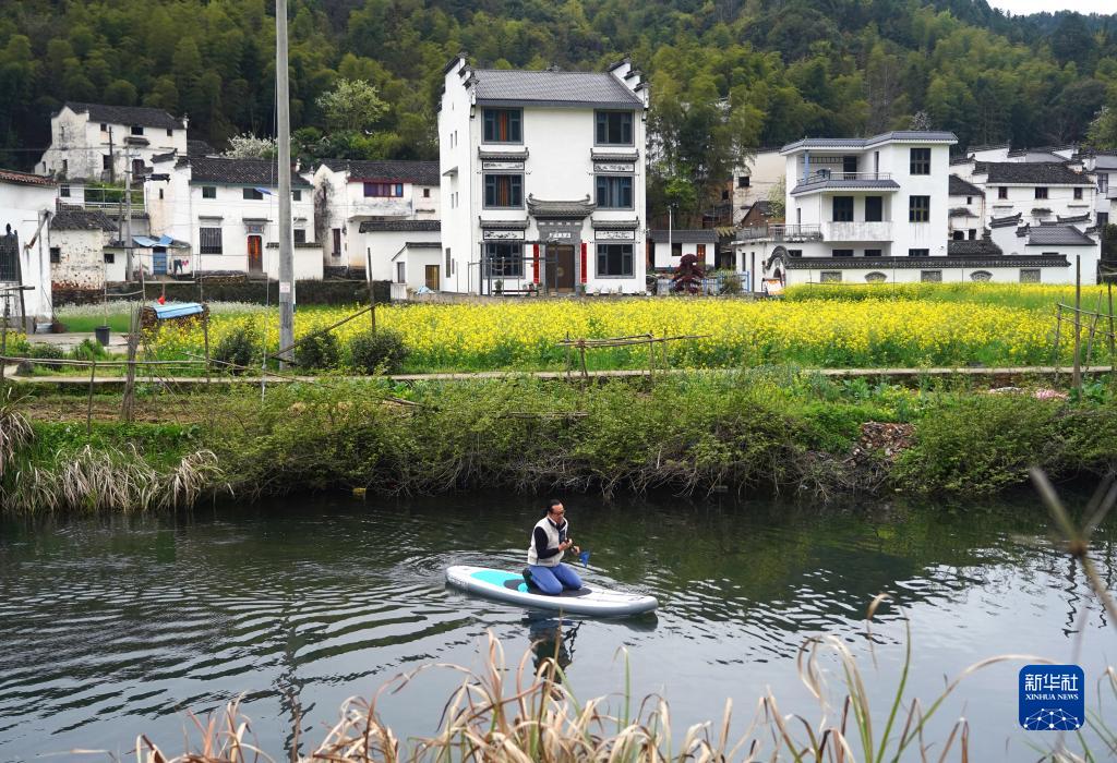 刘龙在民宿前的小河中划桨板(3月29日摄)。新华社记者 万象 摄