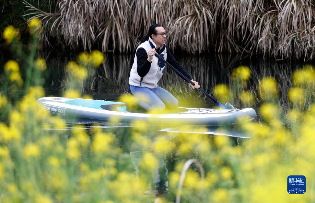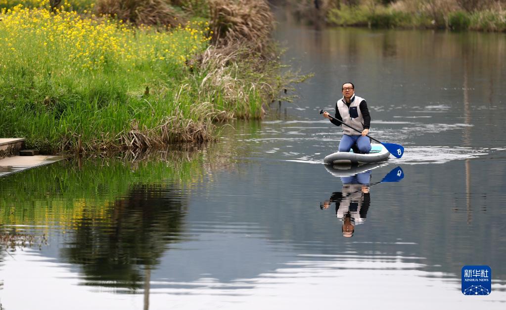 刘龙在民宿前的小河中划桨板(3月29日摄)。新华社记者 张晨 摄