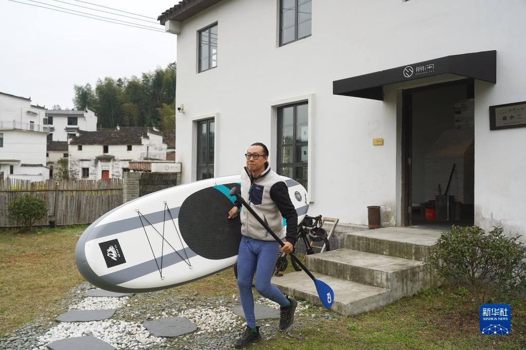 刘龙手提桨板从民宿走出(3月29日摄)。新华社记者 万象 摄