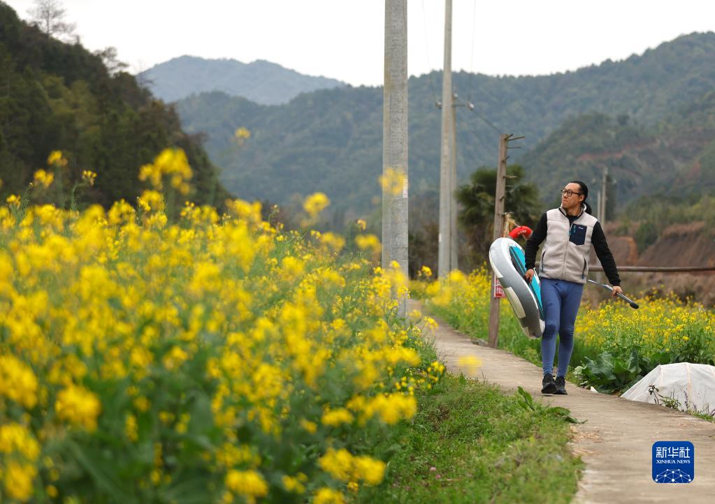 刘龙手提桨板走在油菜花盛开的乡间小路上(3月29日摄)。新华社记者 张晨 摄