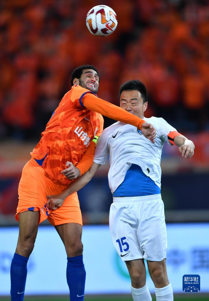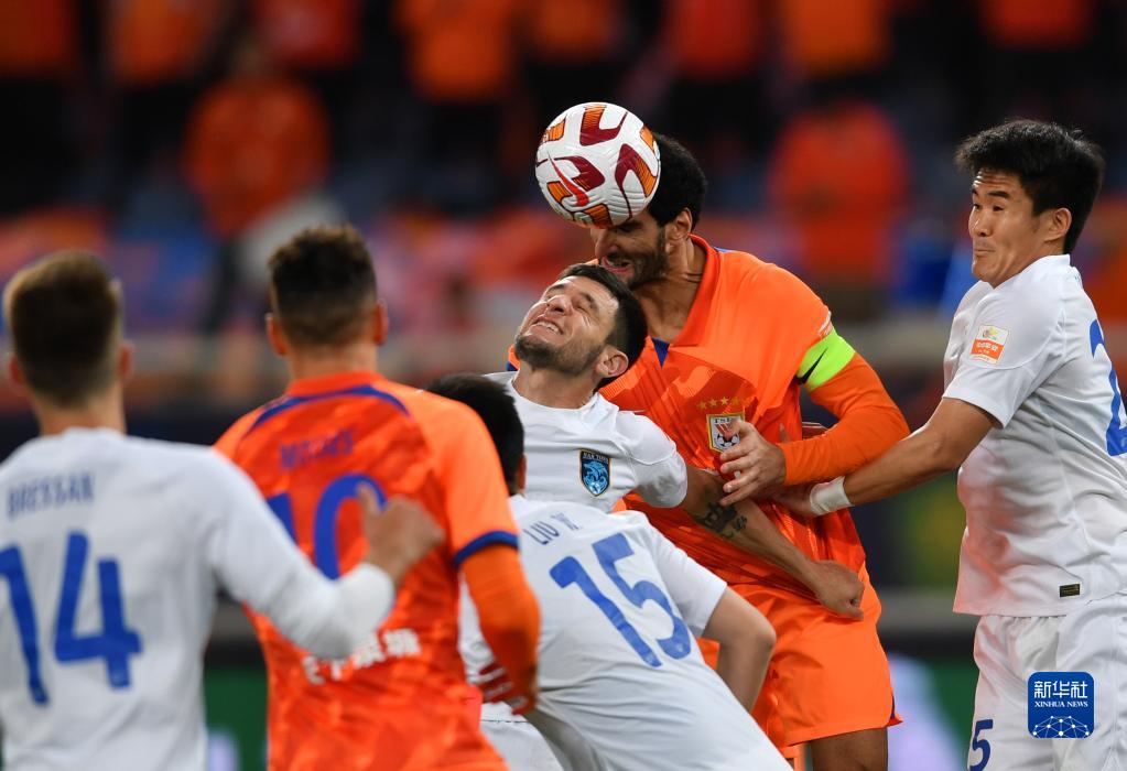 4月21日,山东泰山队球员费莱尼(右二)在比赛中争顶。新华社记者 徐速绘 摄