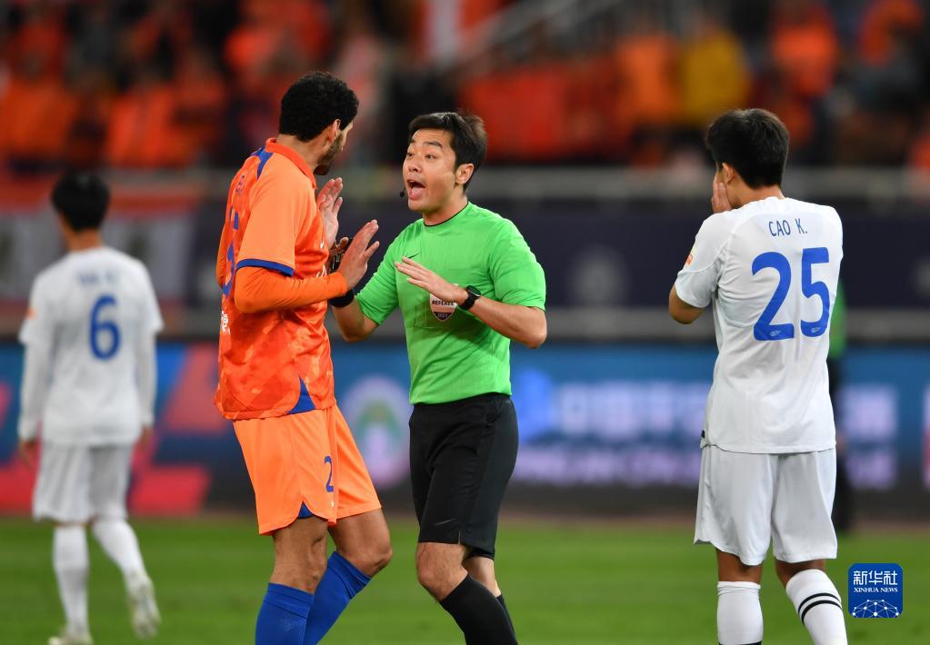 4月21日,主裁判金京元(右二)与山东泰山队球员费莱尼在比赛中交谈。新华社记者 徐速绘 摄