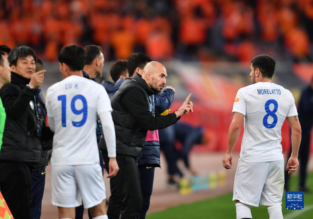 4月21日,南通支云队主教练帕特里西奥(右二)在比赛中与球员交流。新华社记者 徐速绘 摄