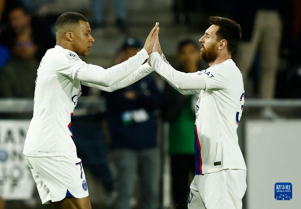 4月21日,巴黎圣日耳曼队球员姆巴佩(左)进球后与队友梅西庆祝。新华社/路透