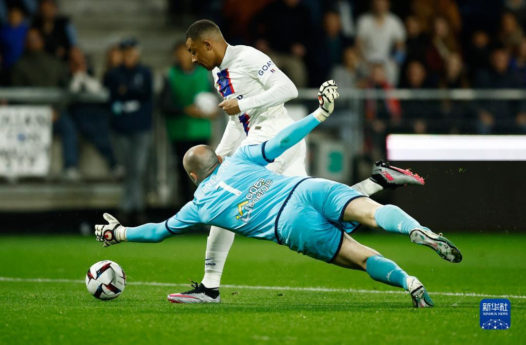 4月21日,巴黎圣日耳曼队球员姆巴佩(上)在比赛中破门。新华社/路透