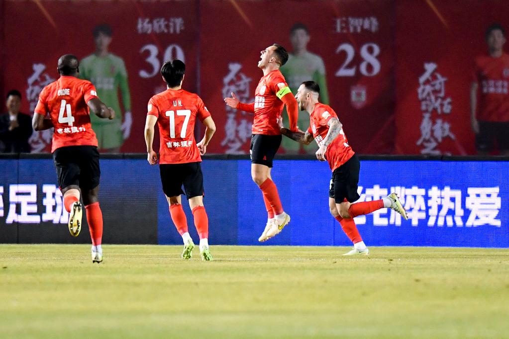 4月22日,长春亚泰队球员塞尔吉尼奥(右二)在比赛中庆祝进球。新华社记者 许畅 摄