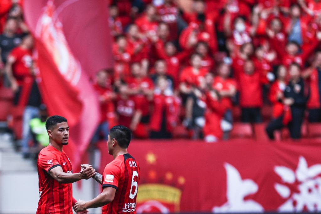 4月22日,上海海港队球员蒋光太(左)与队友蔡慧康在比赛中庆祝。新华社发