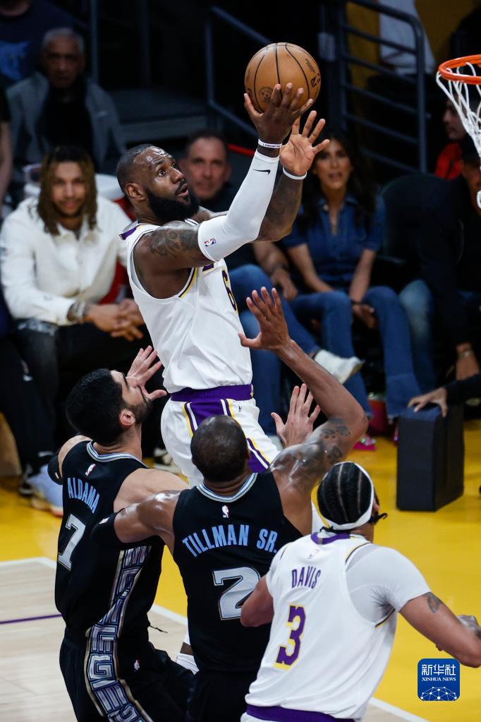 4月22日,湖人队球员勒布朗·詹姆斯(上)在比赛中进攻。新华社发(赵汉荣摄)