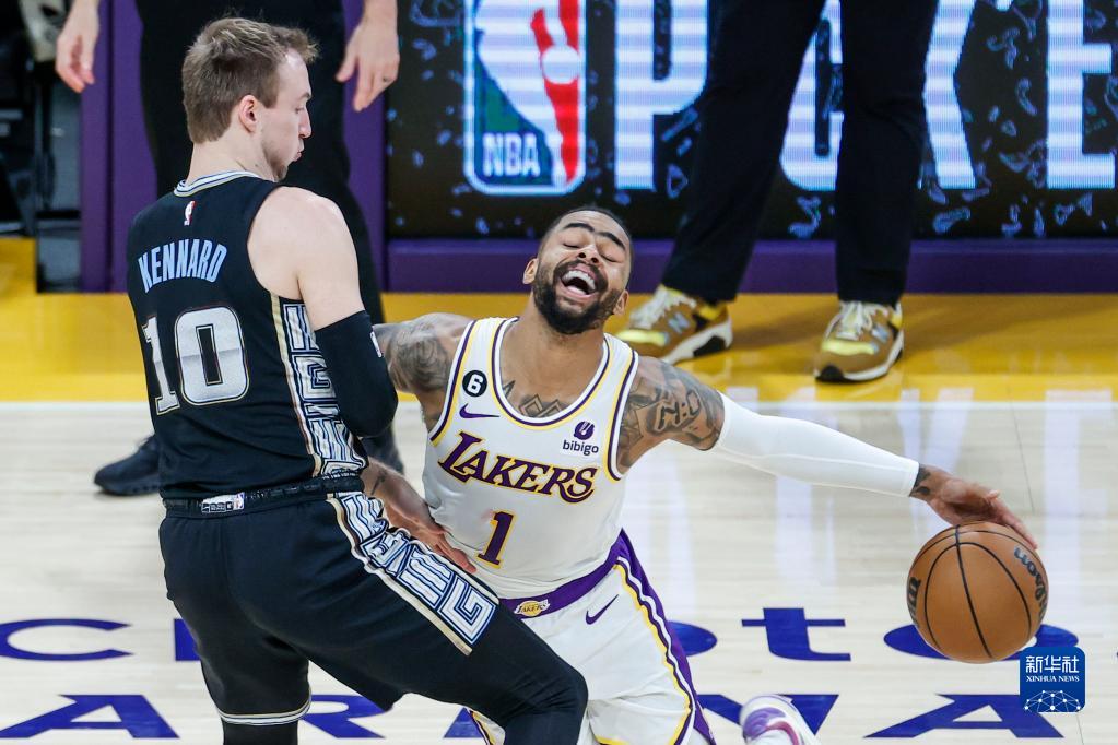 4月22日,湖人队球员丹吉洛·拉塞尔(右)在比赛中进攻受阻。新华社发(赵汉荣摄)