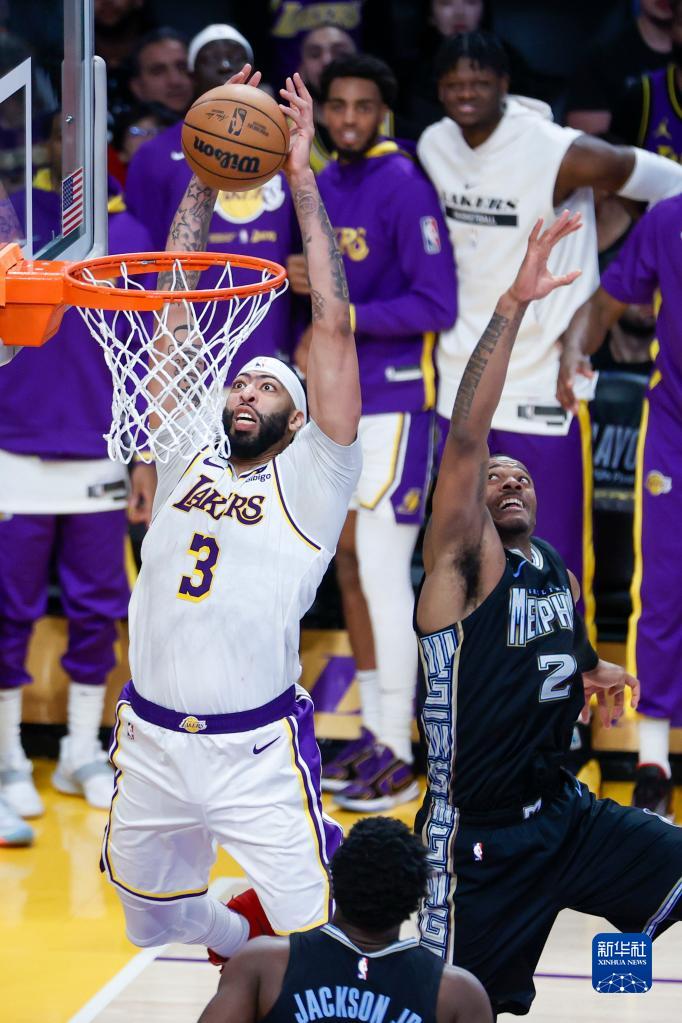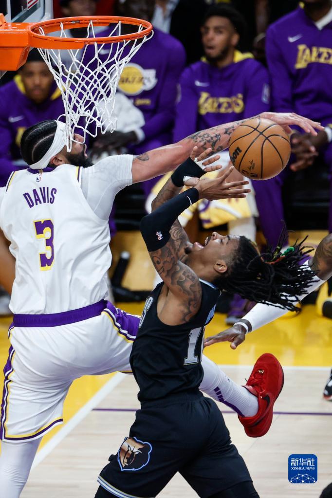 4月22日,湖人队球员安东尼·戴维斯(左)封盖灰熊队球员贾·莫兰特。新华社发(赵汉荣摄)