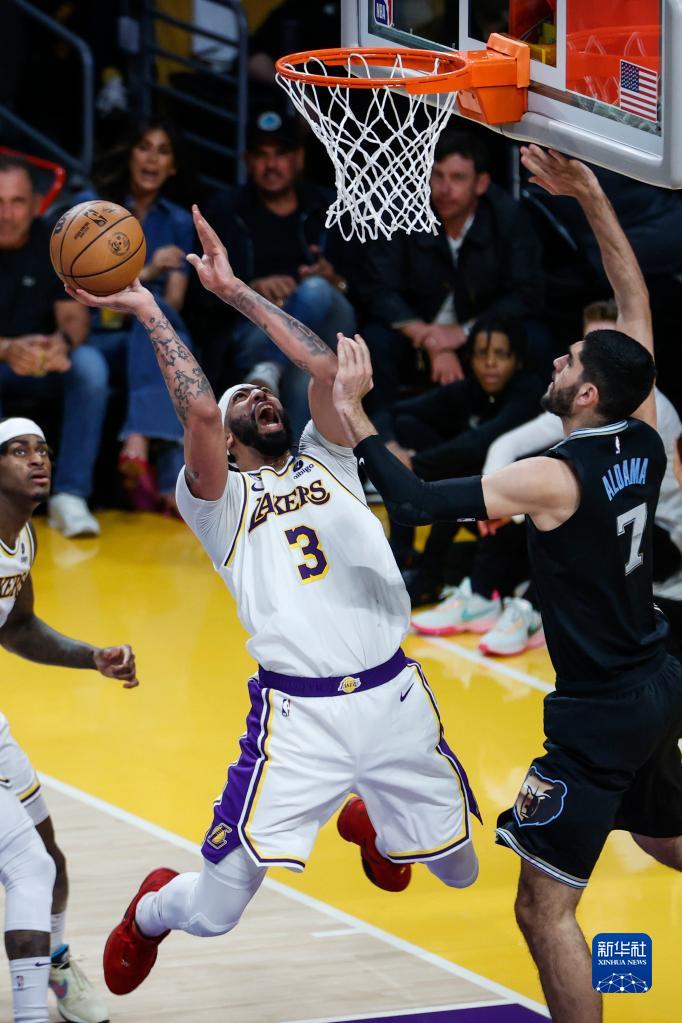 4月22日,湖人队球员安东尼·戴维斯(左)在比赛中上篮。新华社发(赵汉荣摄)