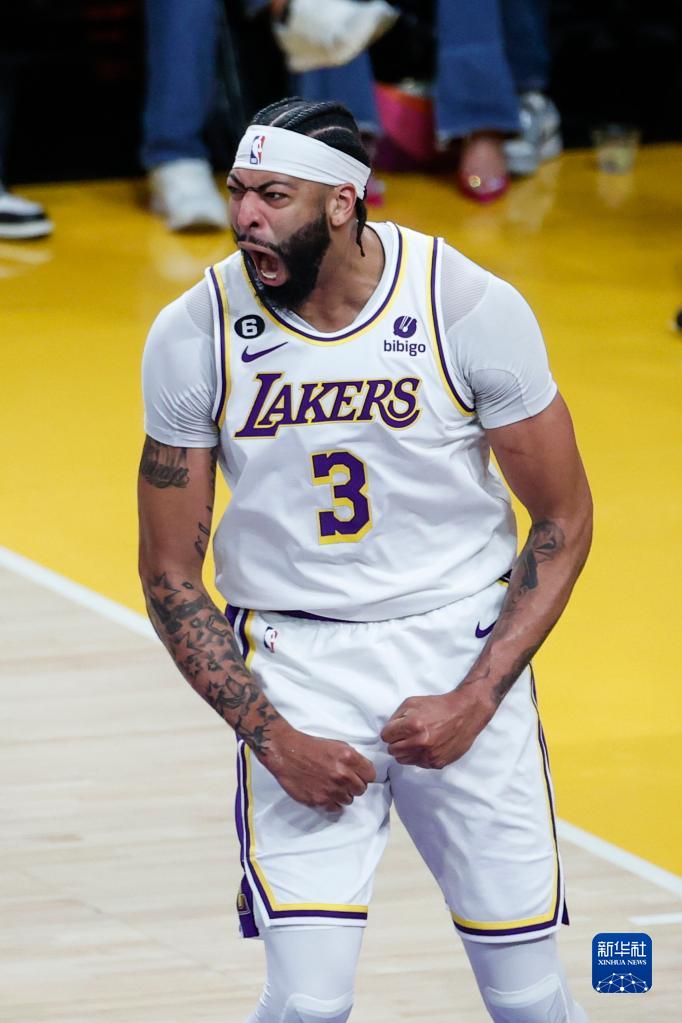 4月22日,湖人队球员安东尼·戴维斯在比赛中庆祝得分。新华社发(赵汉荣摄)