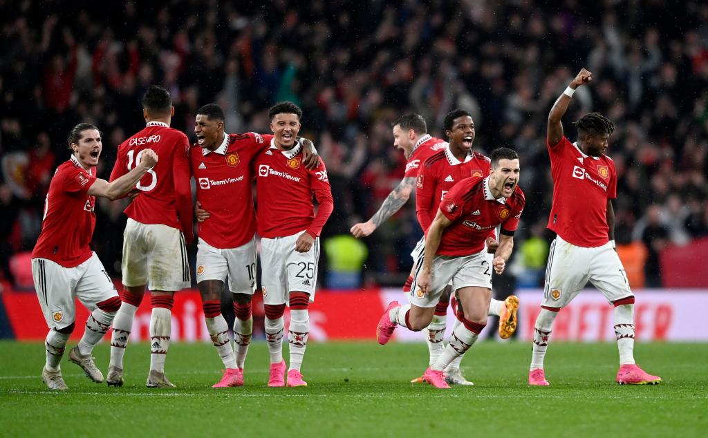 4月23日,曼联队球员在点球大战后庆祝比赛胜利。