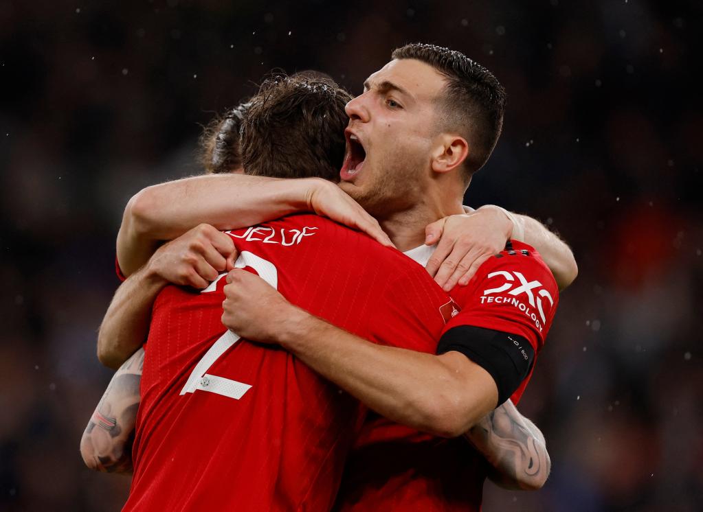 4月23日,曼联队球员林德洛夫(左)打进制胜的一个点球后与队友达洛特拥抱庆祝。