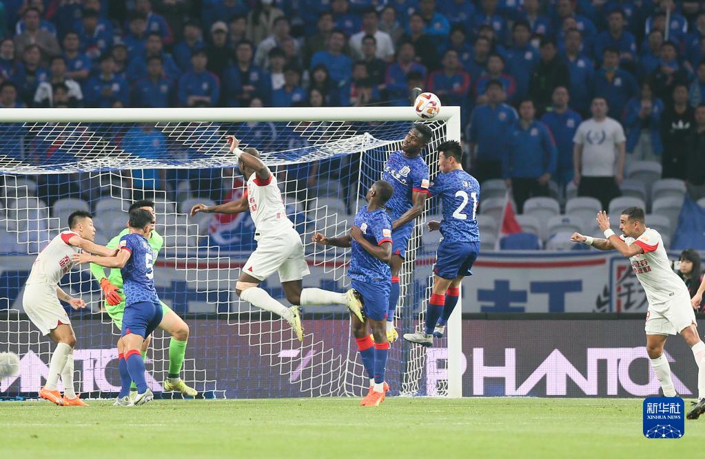 4月26日,上海申花队球员马莱莱(右三)在比赛中争顶。新华社记者 丁汀 摄