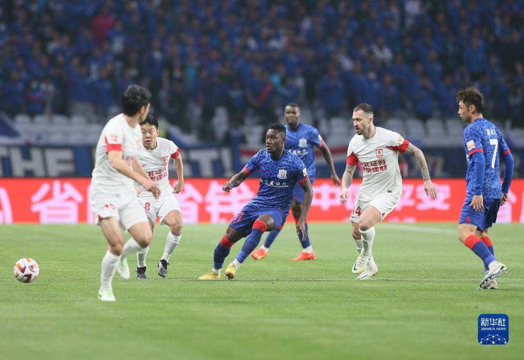 4月26日,上海申花队球员马莱莱(左三)在比赛中传球。新华社记者 丁汀 摄