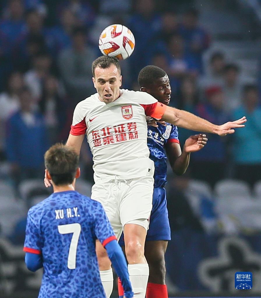 4月26日,长春亚泰队球员塞尔吉尼奥(中)在比赛中争顶。新华社记者 丁汀 摄