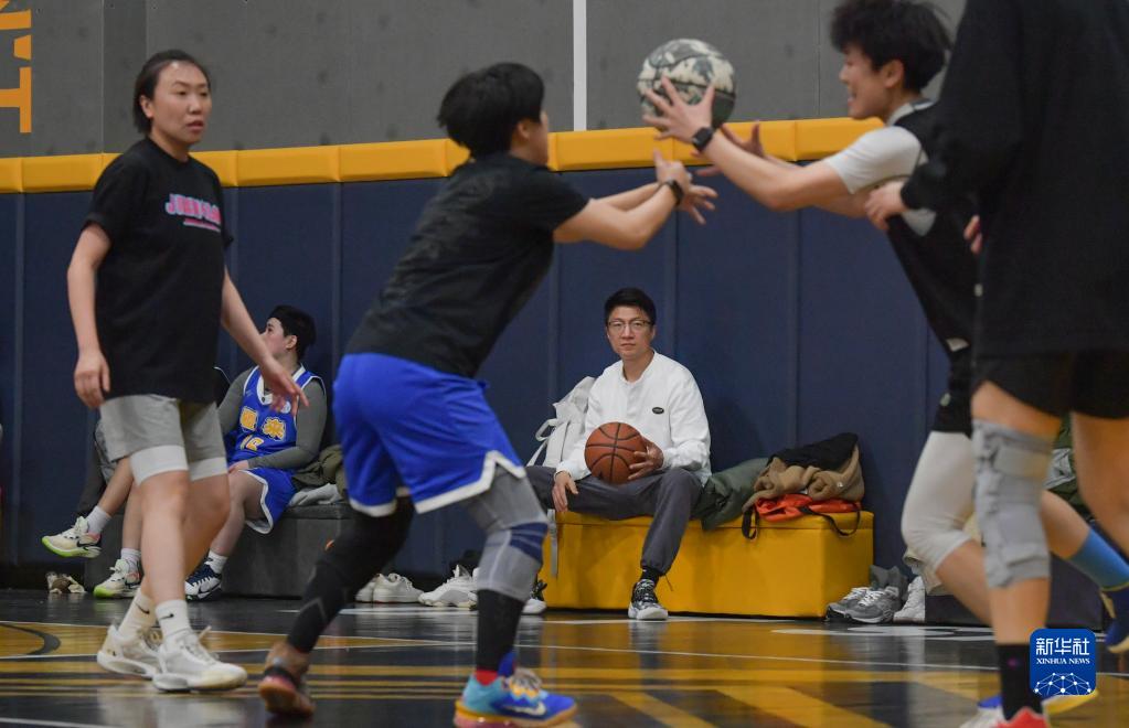 这是“疆来”女子篮球俱乐部成员戴珊珊(左一)在日常训练中,她的爱人(左四)在场边等待(3月5日摄)。新华社记者 王菲 摄