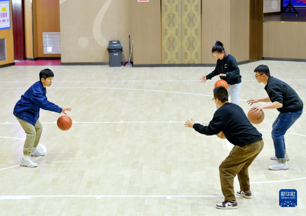 这是王娜在工作之余给喜爱篮球的同事讲解动作要领(4月3日摄)。新华社记者 王菲 摄