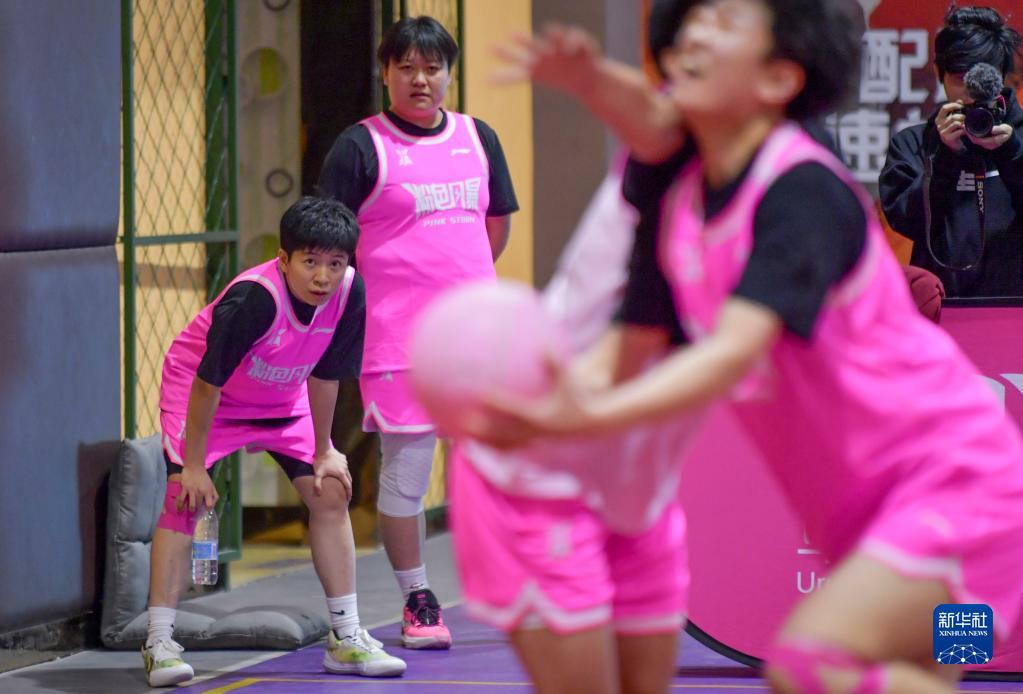 这是“疆来”女子篮球俱乐部成员在“粉色风暴”全国女子篮球城市赛乌鲁木齐站比赛中(4月2日摄)。新华社记者 王菲 摄