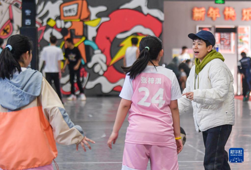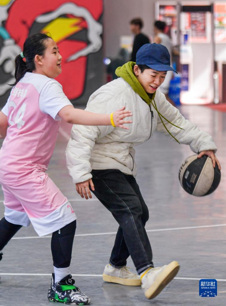 这是王娜(右)在一家篮球馆与“疆来”女篮俱乐部训练营的小队员互动(3月26日摄)。新华社记者 王菲 摄