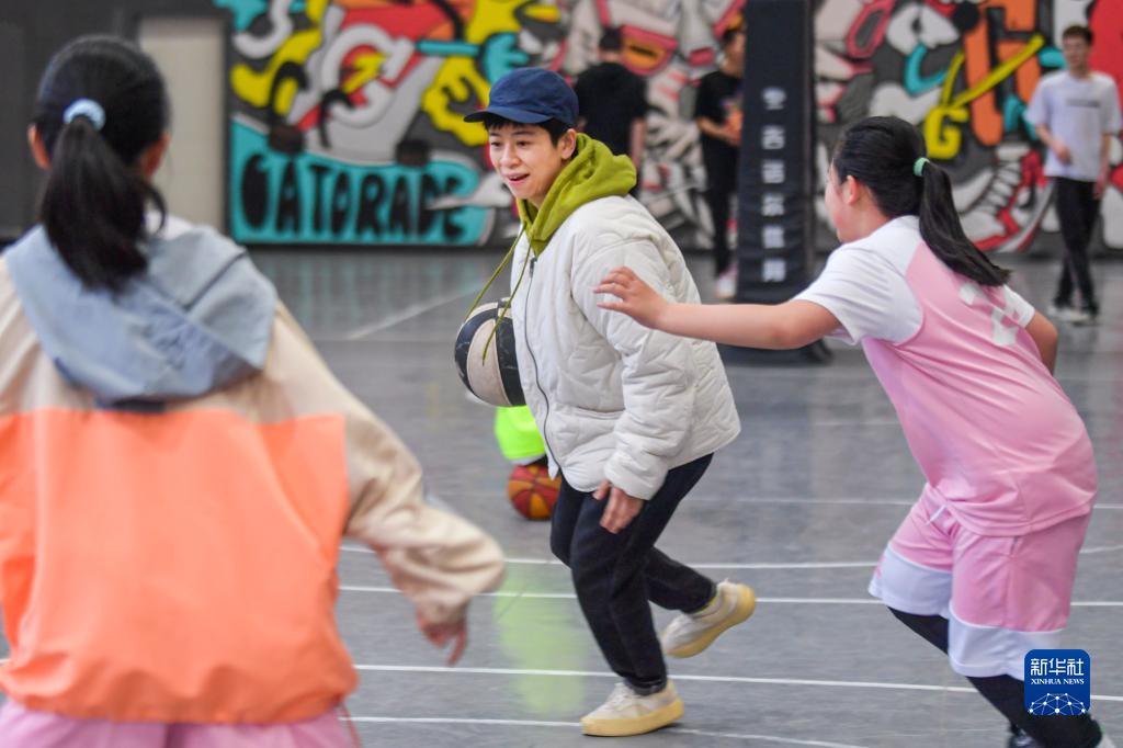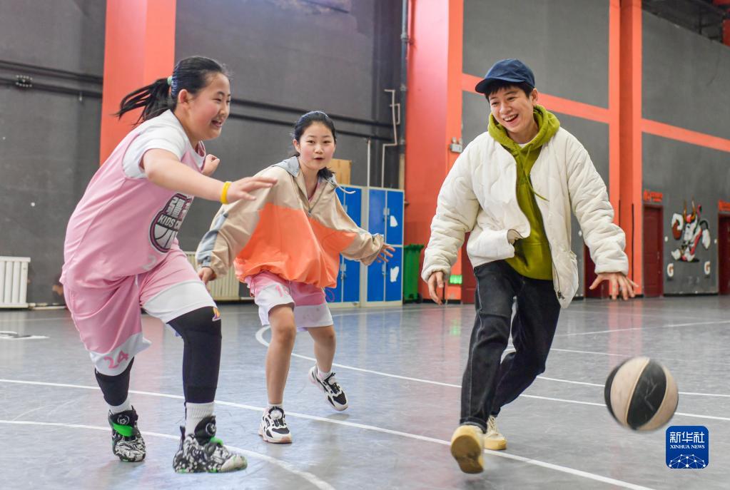 这是王娜(中)在一家篮球馆与“疆来”女篮俱乐部训练营的小队员互动(3月26日摄)。新华社记者 王菲 摄