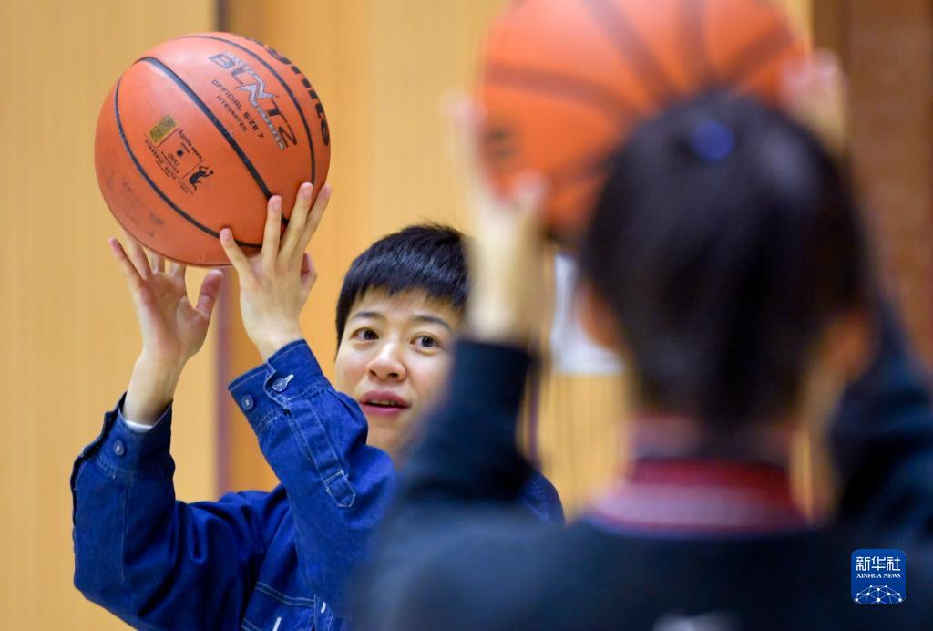 这是王娜(左)在工作之余给喜爱篮球的同事讲解动作要领(4月3日摄)。新华社记者 王菲 摄