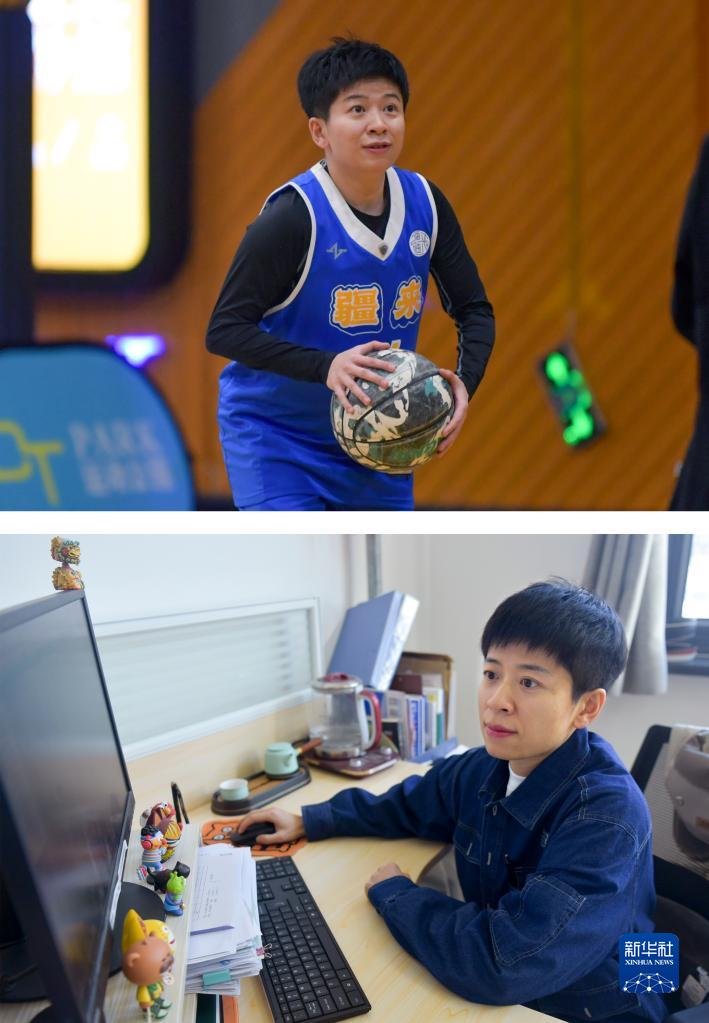 这是一张拼版照片。上图:王娜在日常训练中打篮球(3月5日摄);下图:王娜在办公室整理工作资料(4月3日摄)。新华社记者 王菲 摄