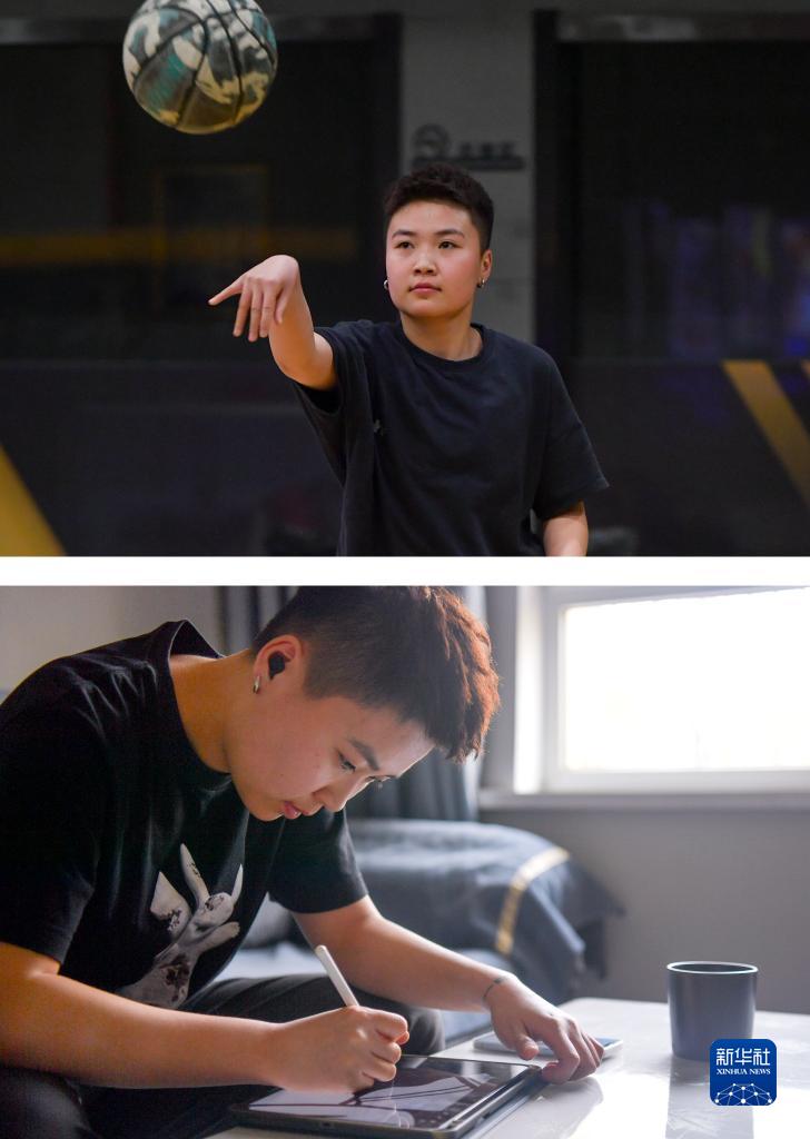 这是一张拼版照片。上图:患有听力障碍的姑娘姚斐文在日常训练中打篮球(3月5日摄)。下图:姚斐文在家绘制一幅电脑绘画订单(4月4日摄)。新华社记者 王菲 摄