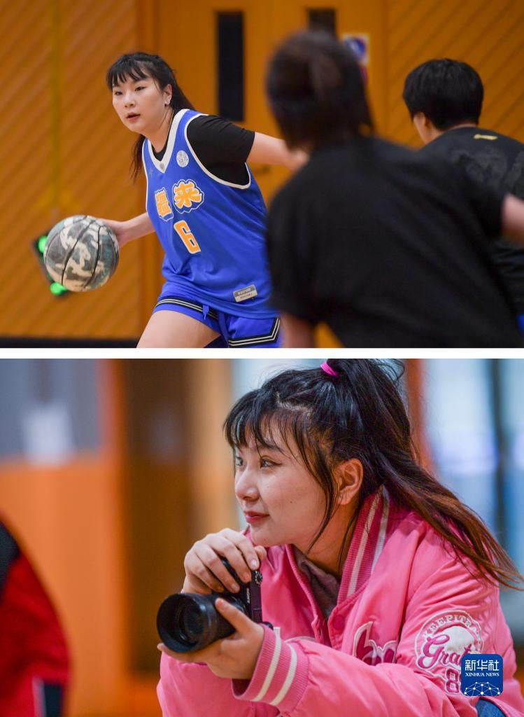 这是一张拼版照片。上图:回族姑娘裴璇在日常训练中打篮球(3月5日摄)。下图:裴璇为参加培训的小孩子拍摄照片(4月30日摄)。新华社记者 王菲 摄
