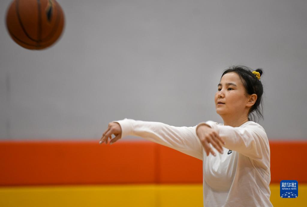 这是“疆来”女子篮球俱乐部成员哈萨克族姑娘根娜在日常训练中(2月23日摄)。新华社记者 王菲 摄