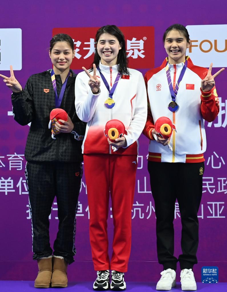 5月4日,冠军江苏卡尔美队选手张雨霏(中)、亚军浙江队选手余依婷(左)和季军山东洲克队选手王一淳在颁奖仪式上合影。新华社记者 黄宗治 摄