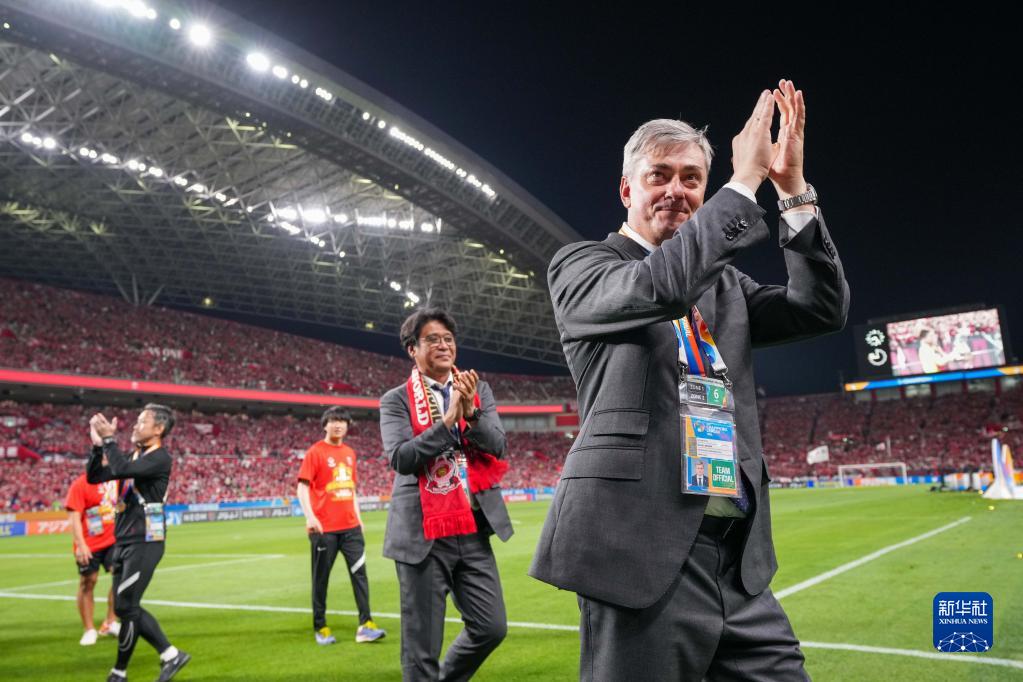 5月6日,浦和红钻队主教练斯科尔扎(右一)在比赛后向观众致意。新华社记者 张笑宇 摄