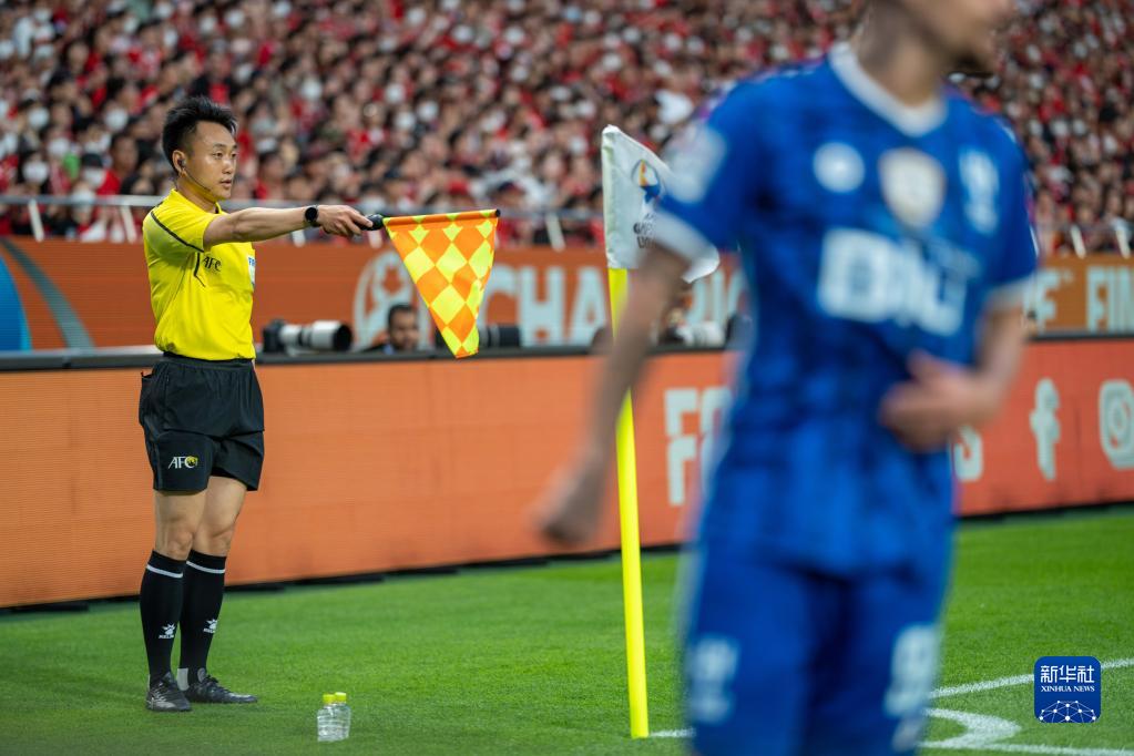 5月6日,助理裁判张铖(左)在比赛中执法。新华社记者 张笑宇 摄