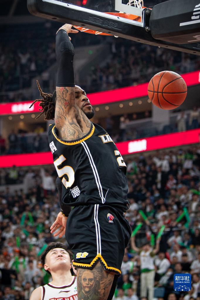 5月8日,辽宁本钢队球员莫兰德在比赛中扣篮。新华社记者 江汉 摄