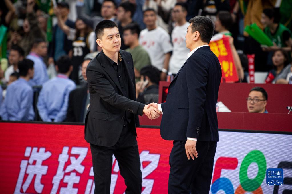 5月8日,辽宁本钢队主教练杨鸣(左)与浙江稠州金租队主教练王世龙在赛后握手。新华社记者 江汉 摄