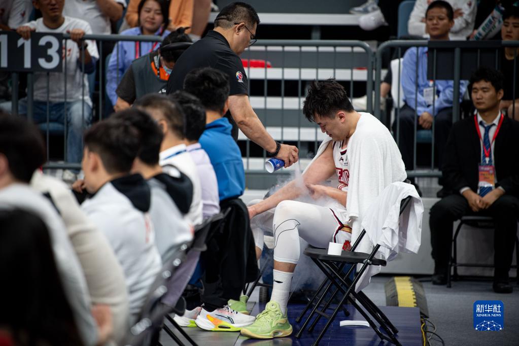 5月8日,浙江稠州金租队球员刘泽一(右)在比赛中受伤后接受治疗。新华社记者 江汉 摄
