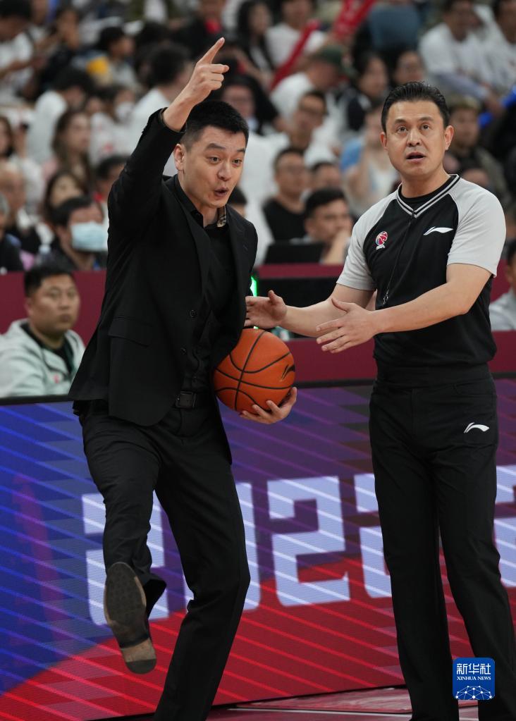 5月8日,辽宁本钢队主教练杨鸣(左)在比赛中与主裁判段铸交流。新华社记者 孟永民 摄