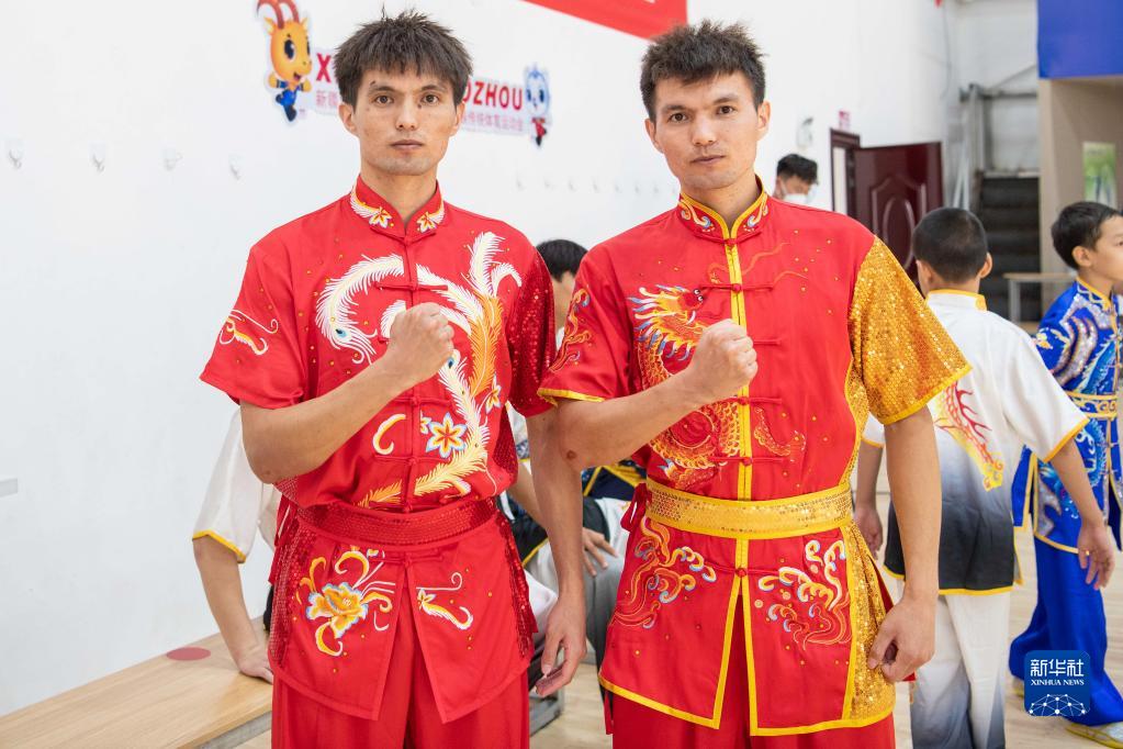 哥哥阿布都拉·巴吐尔江(左)和弟弟阿布都热合曼·巴吐尔江在新疆第十届少数民族传统体育运动会上留影(2022年9月14日摄)。新华社记者 胡虎虎 摄