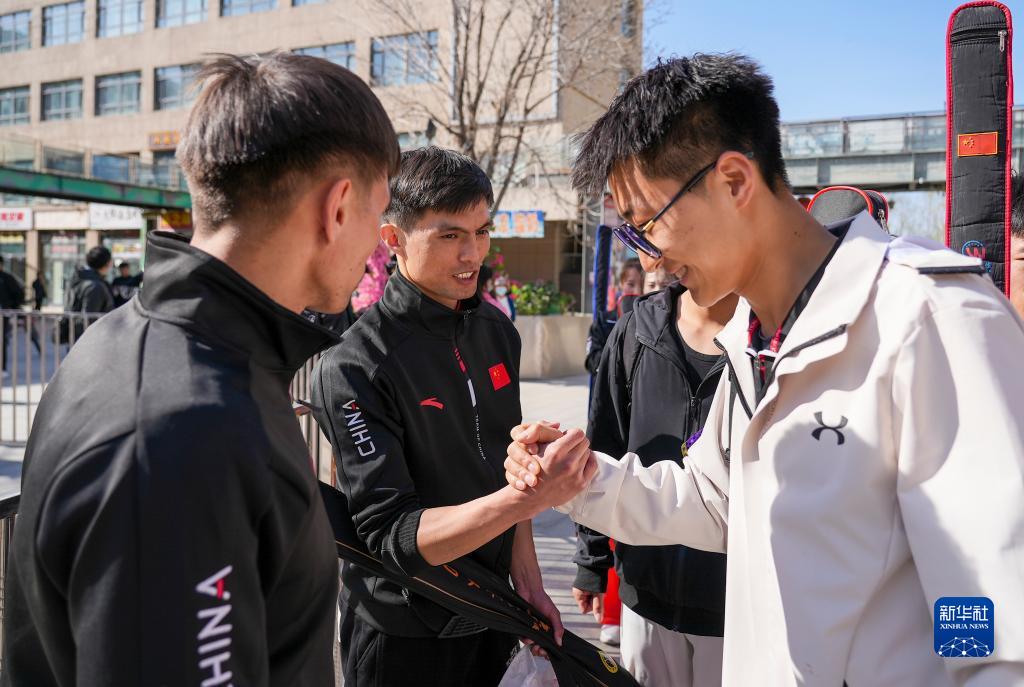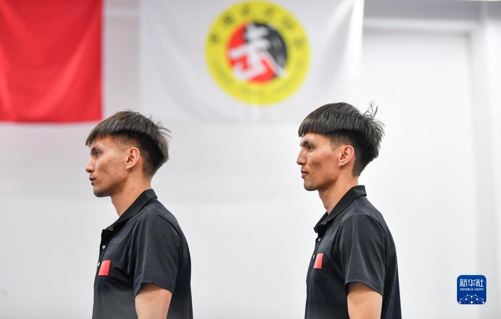 哥哥阿布都拉·巴吐尔江(右)和弟弟阿布都热合曼·巴吐尔江在新疆昌吉学院训练馆参加训练(4月19日摄)。新华社记者 胡虎虎 摄