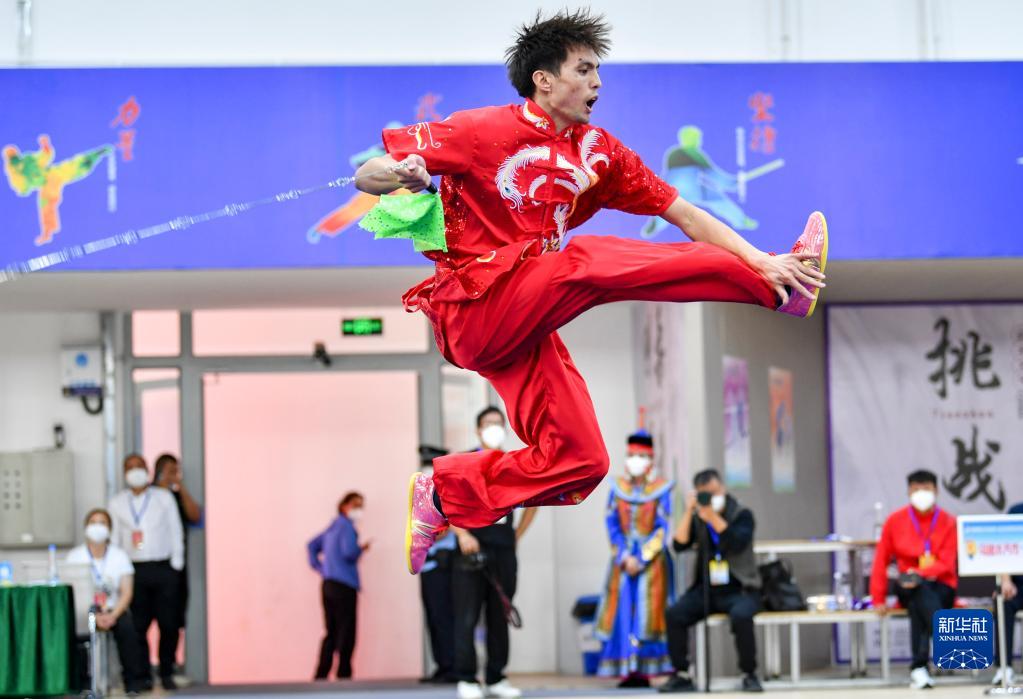 阿布都拉·巴吐尔江在新疆第十届少数民族传统体育运动会男子传统软器械类比赛中表演九节鞭(2022年9月15日摄)。新华社记者 胡虎虎 摄
