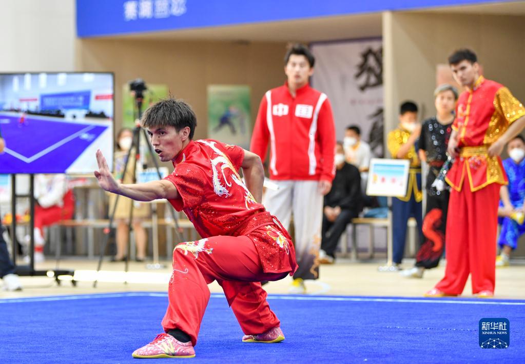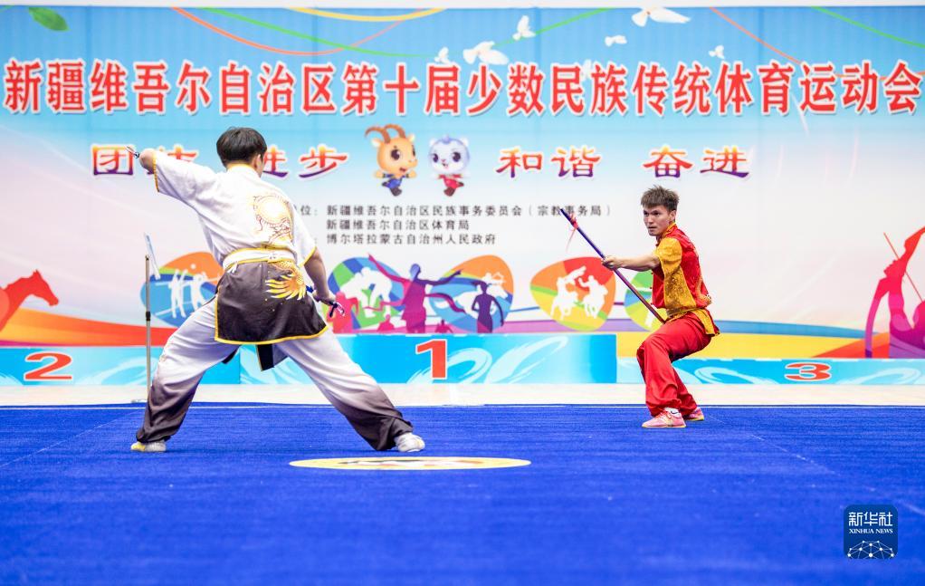 阿布都热合曼·巴吐尔江(右)与队友马文博在新疆第十届少数民族传统体育运动会男子器械对练项目中(2022年9月13日摄)。新华社记者 胡虎虎 摄