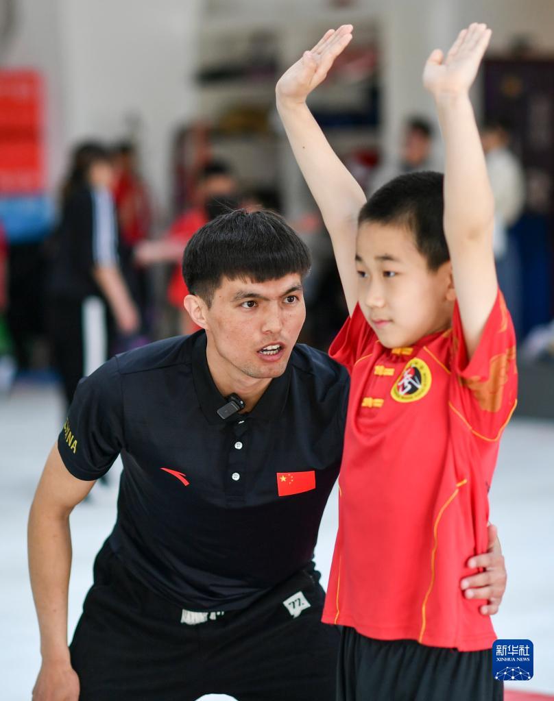 哥哥阿布都拉·巴吐尔江(前右)在训练中帮助弟弟阿布都热合曼·巴吐尔江纠正动作(4月19日摄)。新华社记者 胡虎虎 摄