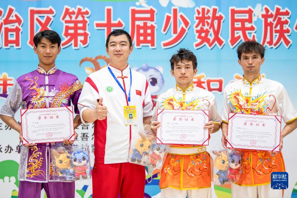 阿布都拉·巴吐尔江(右一)与教练赵厚安(左二)、队友马永鑫(左一)、艾散·玉苏普艾麦提在新疆第十届少数民族传统体育运动会上获得男子器械对练项目一等奖后合影(2022年9月13日摄)。新华社记者 胡虎虎 摄