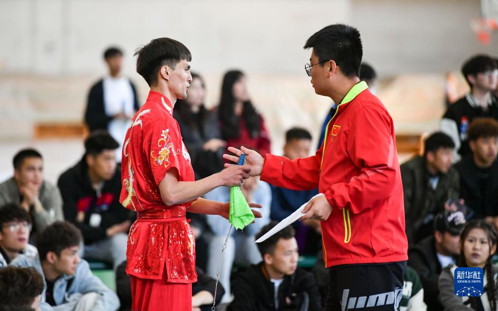 阿布都拉·巴吐尔江(左)在新疆昌吉学院武术比赛表演选拔赛上听取武术老师袁军讲解九节鞭动作要领(4月20日摄)。新华社记者 胡虎虎 摄